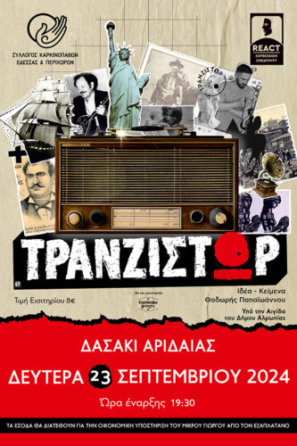 Σας προσκαλούμε σε μια ξεχωριστή παράσταση στις 23 Σεπτεμβρίου στο ανοιχτό θέατρο Δασάκι Αριδαίας, στις 19.30, με τίτλο «ΤρανζίστΩρ», μια ιδέα του Θοδωρή Παπαϊωάννου όπου το θέατρο και η μουσική γίνονται το όχημα για να αγγίξουμε τις καρδιές μας και να απαλύνουμε τον πόνο συνανθρώπων μας.