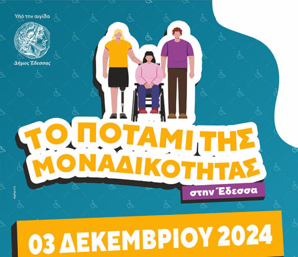 Με αφορμή την Παγκόσμια Ημέρα Ατόμων με Αναπηρία και με πρωτοβουλία του Συλλόγου Γονέων και Ατόμων με Αναπηρία της Έδεσσας οργανώνεται για πρώτη φορά μια μοναδική συλλογική δράση την Τρίτη 3 Δεκεμβρίου, 10.30 π.μ. στον πεζόδρομο και στα Μικρά Καταρρακτάκια, υπό την αιγίδα του Δήμου Έδεσσας.