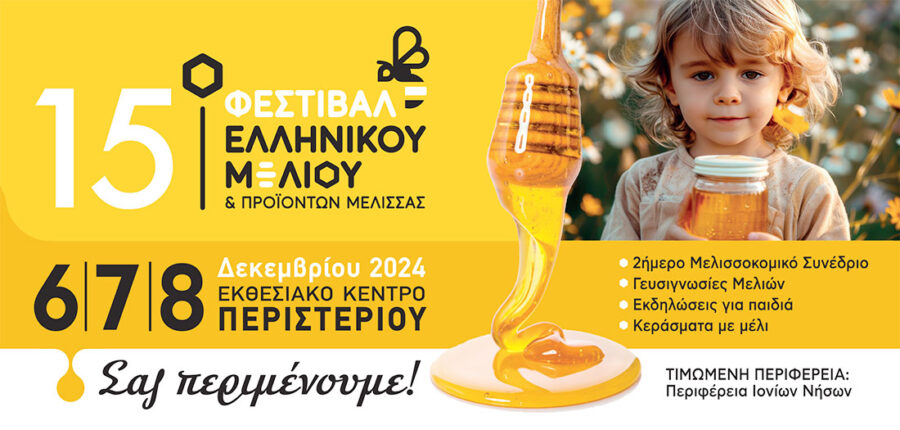 Το 15ο Φεστιβάλ Ελληνικού Μελιού & Προϊόντων Μέλισσας ανοίγει τις πύλες του την Παρασκευή 6 Δεκεμβρίου στις 16:00 και θα διαρκέσει έως το βράδυ της Κυριακής 8 Δεκέμβριου, στο Διεθνές Εκθεσιακό Κέντρο Περιστερίου.
