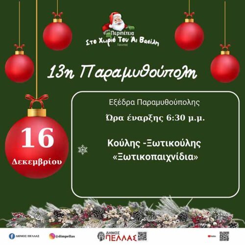 ΓΙΑΝΝΙΤΣΑ-13η ΠΑΡΑΜΥΘΟΥΠΟΛΗ: ΞΩΤΙΚΟΠΑΙΧΝΙΔΙΑ (16/12) Γιαννιτσά Ελλάδα Μακεδονία Νέα Πολιτισμός - Θρησκεία ΠΟΛΙΤΙΣΜΟΣ-ΘΡΗΣΚΕΙΑ 16 Δεκεμβρίου 202416 Δεκεμβρίου 2024Edessaiki Team