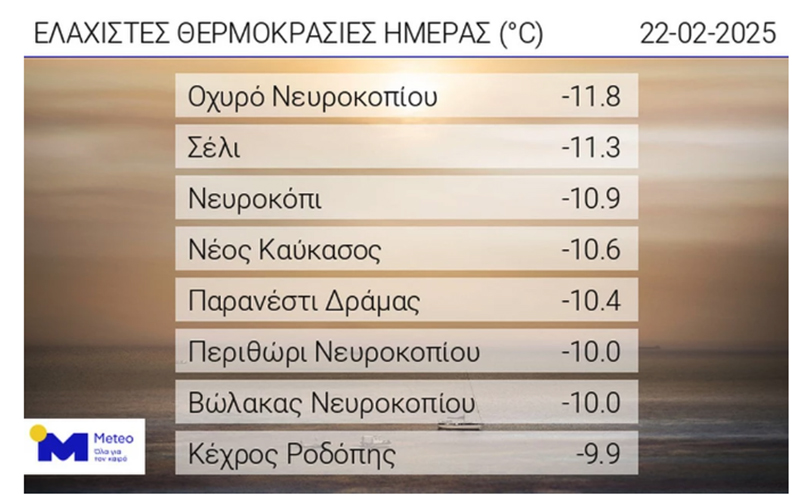 Σύμφωνα με το δίκτυο αυτόματων μετεωρολογικών σταθμών του meteo.gr / Εθνικού Αστεροσκοπείου Αθηνών, η ελάχιστη σημειώθηκε στο Οχυρό Νευροκοπίου (-11.8 °C) και ακολούθησαν το Σέλι (-11.3°C) και το Νευροκόπι (-10.9°C).