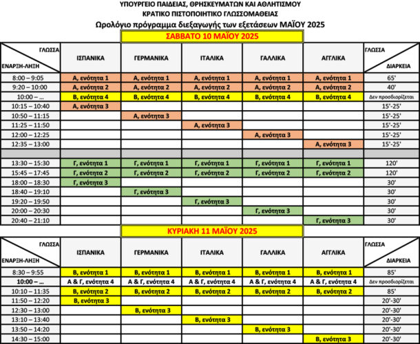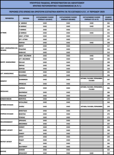 Από το Υπουργείο Παιδείας, Θρησκευμάτων και Αθλητισμού ανακοινώνεται ότι οι Εξετάσεις του Κρατικού Πιστοποιητικού Γλωσσομάθειας Α’ εξεταστικής περιόδου 2025, θα διεξαχθούν το Σάββατο 10 Μαΐου και την Κυριακή 11 Μαΐου για την πιστοποίηση της γνώσης των γλωσσών Αγγλικής, Γαλλικής, Γερμανικής, Ιταλικής και Ισπανικής για τα επίπεδα:
