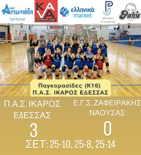 Την Κυριακή στο πρωτάθλημα των Παγκορασίδων (Κ16) η ομάδα Π.Α.Σ. ΙΚΑΡΟΣ ΕΔΕΣΣΑΣ φιλοξένησε και κέρδισε 3-0 (ΣΕΤ: 25-10, 25-8, 25-14) την ομάδα Ζαφειράκη Νάουσας. Η ομάδα της Έδεσσας αξιοποίησε όλες τις αθλήτριες που ήταν στην αποστολή. Η διαφορά των πόντων υπερ της Έδεσσας ήταν μεγάλη καθ’ όλη τη διάρκεια του αγώνα. Πήραν χρόνο συμμετοχής όλες οι αθλήτριες της Έδεσσας.