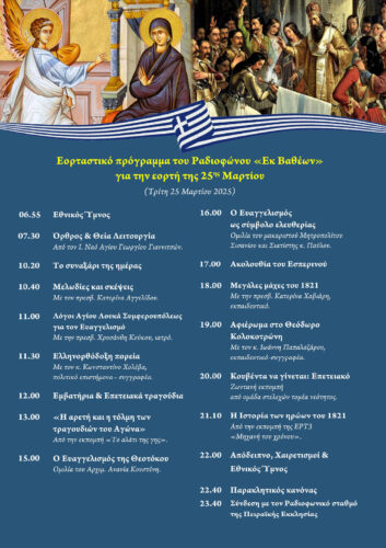 Ο Διαδικτυακός Ραδιοφωνικός Σταθμός «Εκ Βαθέων» την Τρίτη 25 Μαρτίου, εορτή του Ευαγγελισμού της Θεοτόκου και της Εθνικής Εθνεγερσίας της 25ης Μαρτίου του 1821, θα λειτουργήσει με ειδικά διαμορφωμένο εορταστικό πρόγραμμα, το οποίο παραθέτουμε.