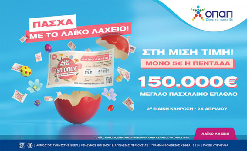 Το Λαϊκό Λαχείο παραμένει σε εορταστικό κλίμα και μοιράζει πασχαλινό έπαθλο ύψους 150.000 ευρώ στην ειδική κλήρωση που θα πραγματοποιηθεί την Παρασκευή 25 Απριλίου.