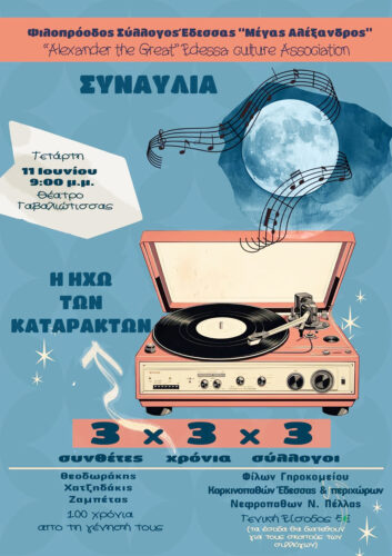 Οι σύλλογοι Φίλοι του Γηροκομείου Έδεσσας, Νεφροπαθών Νομού Πέλλας και Καρκινοπαθών Έδεσσας & περιχώρων ενώνουν τις δυνάμεις τους σε μια ξεχωριστή μουσική εκδήλωση με την χορωδία του Φιλοπρόοδου Συλλόγου Έδεσσας «Μέγας Αλέξανδρος» την β με σκοπό την υποστήριξη των δράσεων τους και την ενίσχυση των έργων τους.