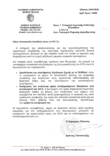 Ο Δήμος Έδεσσας με επιστολή του προς το Υπουργείο Αγροτικής Ανάπτυξης, τον ΕΛ.Γ.Α. και το Υπουργείο Ψηφιακής Διακυβέρνησης, παρενέβη με στόχο την εξάλειψη της τριτοκοσμικής εικόνας που παρουσιάζεται κατά την περίοδο δηλώσεων ζημίας φυτικού κεφαλαίου λόγω καιρικών φαινομένων, που άδικα ταλαιπωρεί τους αγρότες του δήμου μας αλλά και όσους άλλους χρειάζεται την περίοδο εκείνη να εξυπηρετηθούν από τις υπηρεσίες του δήμου.
