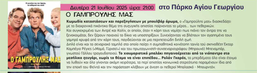 Σήμερα, Δευτέρα 21 Ιουλίου, θα προβληθεί η κωμωδία “Ο Γαμπρούλης μας” (2019), στο πάρκο Αγίου Γεωργίου, στις 9 το βράδυ.