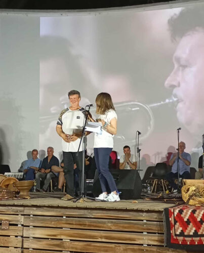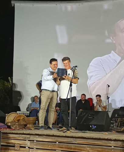 Πρωταγωνιστής, όμως, της βραδιάς, ήταν ο Τάσος Δίσκος, ο καλλιτέχνης … πολυεργαλείο, ο οποίος βραβεύτηκε απ’ τον Φιλοπρόοδο Σύλλογο Εδεσσας “Μέγας Αλέξανδρος” και, συγκινημένος, ευχαρίστησε όλους όσοι παρευρίσκονταν στον πανέμορφο χώρο του θερινού σινεμά “Καταρράκτες”.