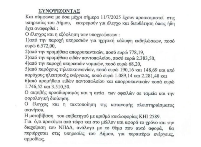 ⚫️Όταν μια δημοτική αρχή φτάνει στο σημείο να παραδέχεται δημόσια ότι δεν μπορεί να προσδιορίσει ούτε το ύψος, ούτε την αιτία των οφειλών, τότε έχουμε να κάνουμε με διοικητική κατάρρευση. Σε μια πρόχειρη και αμήχανη απόπειρα «απογραφής» υποχρεώσεων, καταγράφονται χιλιάδες ευρώ σε οφειλές για παντοπωλεία, απορρυπαντικά, τηλεπικοινωνίες, νομικές υπηρεσίες, ταμεία και φορολογική διοίκηση — χωρίς να μπορεί να εξηγηθεί από πού προκύπτουν και γιατί δεν έχουν εξοφληθεί.