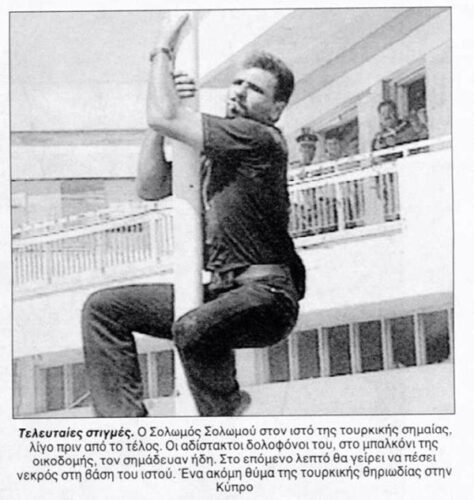 «Μια τηλεοπτική εικόνα κάνει τον γύρο του κόσμου τον Αύγουστο. Ένα παλικάρι πάνω στον ιστό σημαίας δολοφονείται εν ψυχρώ από τον Αττίλα. Ο Σολομών Σολωμού με ένα τσιγάρο στο στόμα αναρριχήθηκε στον ιστό για να κατεβάσει την κατοχική σημαία στη Δερύνεια, στη νεκρή ζώνη, μερικά μόνο μέτρα από την Αμμόχωστο, την πόλη – φάντασμα όπως την αποκαλούν, και χτυπήθηκε άνανδρα από τους εγκάθετους της Αγκυρας.