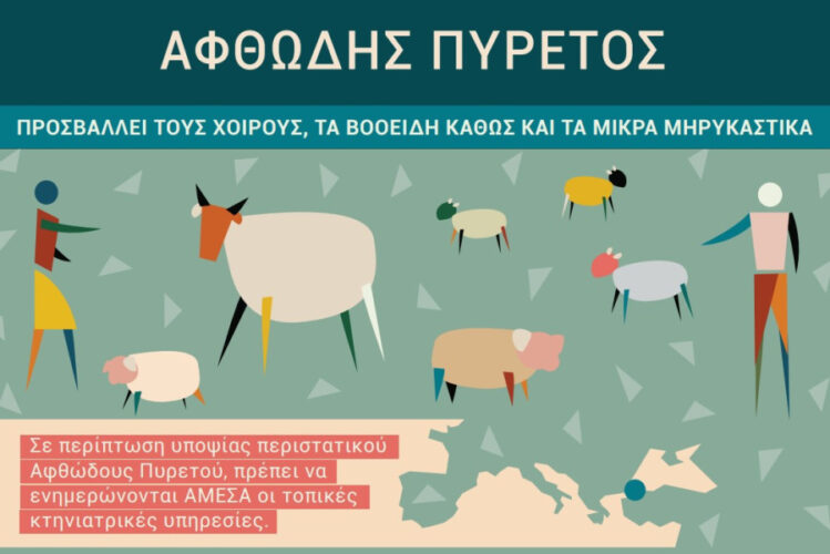 Σύμφωνα με την υπ’ αριθ. πρωτ. 217099/11.08.2025 εγκύκλιο του Τμήματος Λοιμωδών και Παρασιτικών Νοσημάτων της Διεύθυνσης Υγείας των Ζώων της Γενικής Διεύθυνσης Κτηνιατρικής του Υπουργείου Αγροτικής Ανάπτυξης και Τροφίμων- ΥΠ.Α.Α.Τ., σας ενημερώνουμε ότι στις 11, 16 και 18 Ιουλίου 2025, οι αρμόδιες αρχές της Τουρκίας κοινοποίησαν ότι επιβεβαιώθηκαν 4 εστίες Αφθώδους πυρετού.