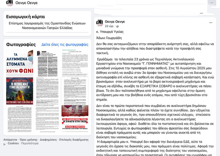 Η τεχνολόγος ακτινολογικού εργαστηρίου Δέσποινα Τζιάκα απαντά δημόσια στον Υπουργό Υγείας Άδωνι Γεωργιάδη, καταγγέλλοντας εκδικητική συμπεριφορά από τη διοίκηση του νοσοκομείου «Γ. Γεννηματάς» μετά την καταγγελία της για σοβαρό περιστατικό πτώσης ανελκυστήρα.