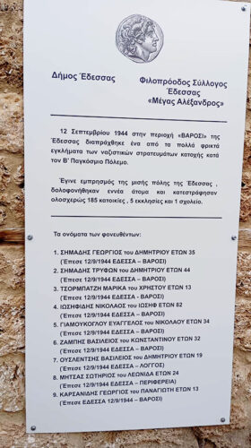 Εννέα συμπολίτες Εδεσσαίοι δολοφονήθηκαν από τους Γερμανούς, στις 12 Σεπτεμβρίου 1944, όταν σημειώθηκε η πυρπόληση της Εδεσσας και καταστράφηκε η μισή πόλη, κάηκαν 185 κατοικίες, 5 εκκλησίες και 1 σχολείο.