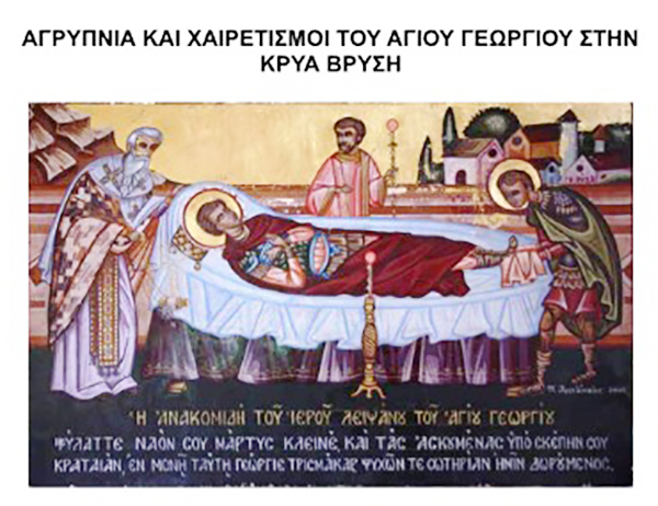 Την Δευτέρα 3 Νοεμβρίου πανηγυρίζει ο ιερός ενοριακός ναός Γεννήσεως του Σωτήρος Κρύας Βρύσης επί τη εορτή της ανακομιδής των ιερών λειψάνων του Αγίου Μεγαλομάρτυρος Γεωργίου του Τροπαιοφόρου σύμφωνα με το παρακάτω πρόγραμμα: