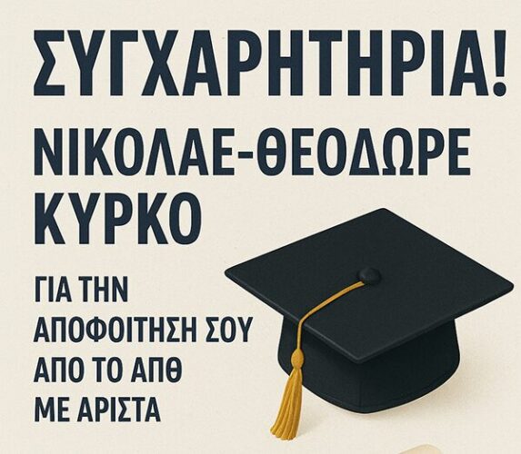 Συγχαρητήρια στον αγαπημένο μας γιο ΝΙΚΟΛΑΟ – ΘΕΟΔΩΡΟ ΚΥΡΚΟ για την αποφοίτησή σου από το Τμήμα Φυσικής του Αριστοτελείου Πανεπιστημίου Θεσσαλονίκης (ΑΠΘ) με ΑΡΙΣΤΑ.