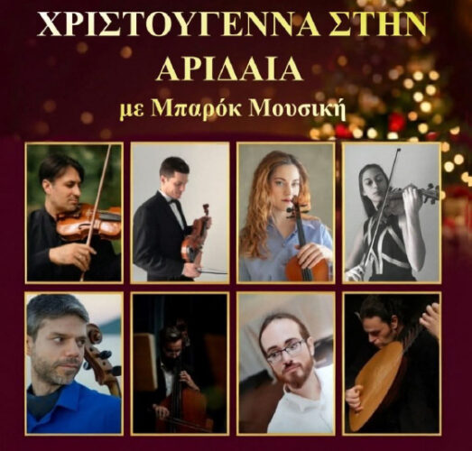 Η Κρατική Ορχήστρα Θεσσαλονίκης και ο Δήμος Αλμωπίας διοργανώνουν, στο πλαίσιο της συνεργασίας τους, Χριστουγεννιάτικη συναυλία στο Ξενιτίδειο Πνευματικό Κέντρο Αριδαίας, με σχήμα μουσικών της Κ.Ο.Θ. και έργα των κορυφαίων εκπροσώπων της μπαρόκ εποχής, όπως οι Κορέλι, Μπαχ και Βιβάλντι.