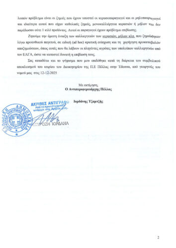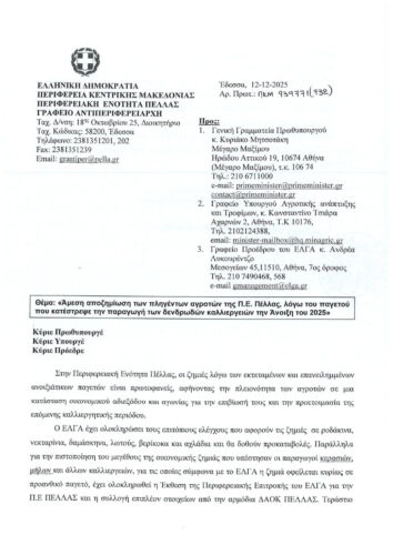 ΘΕΜΑ: ΑΜΕΣΗ ΑΠΟΖΗΜΙΩΣΗ ΤΩΝ ΠΛΗΓΕΝΤΩΝ ΑΓΡΟΤΩΝ ΤΗΣ ΠΕ ΠΕΛΛΑΣ ΛΟΓΩ ΤΟΥ