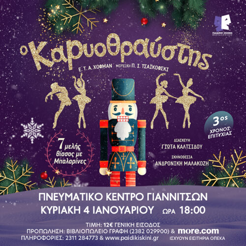 Η Παιδική Σκηνή Θεσσαλονίκης παρουσιάζει την ωραιότερη χριστουγεννιάτικη ιστορία, «Ο Καρυοθραύστης», του Γερμανού Έρνεστ Τέοντορ Αμαντέους Χόφμαν, με επτά ηθοποιούς και χορευτές επί σκηνής και σε μουσική Τσαϊκόφσκι! Έπειτα από 2 συνεχόμενες σεζόν με απανωτά sold-out στη Θεσσαλονίκη, έρχεται τώρα στα Γιαννιτσά, στη σκηνή του Πνευματικού Κέντρου, για μια μόνο παράσταση, στις 4 Ιανουαρίου.