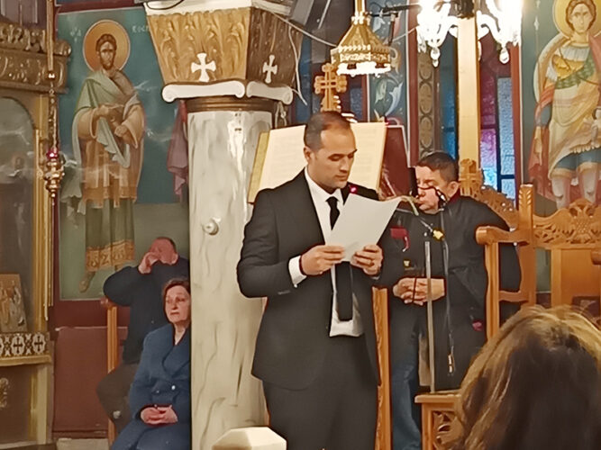 Παρά το ψύχος και την συνεχή βροχή τελέσθηκε κανονικά το τρισάγιο και οι καταθέσεις στεφάνων στην προτομή του Ιερέα Παπαστογιάννη, στον προαύλιο χώρο της Εκκλησίας.