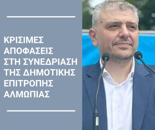 Η τακτική δια ζώσης συνεδρίαση της Δημοτικής Επιτροπής Δήμου Αλμωπίας θα διεξαχθεί στο Δημοτικό Κατάστημα Αριδαίας, τη Δευτέρα 16 Φεβρουαρίου και ώρα 10 π.μ.