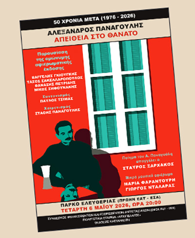 Με την συμπλήρωση πενήντα χρόνων από τον θάνατο του Αλέξανδρου Παναγούλη (1η Μαΐου 1976), ‘’Ο Σύνδεσμος Φυλακισθέντων και Εξορισθέντων Αντιστασιακών (Σ.Φ.Ε.Α 1967-1974)’’, η Πολιτιστική «Εταιρεία Αρχιπέλαγος», και οι ΕΚΔΟΣΕΙΣ ΚΑΣΤΑΝΙΩΤΗ διοργανώνουν εκδήλωση παρουσίασης της αφιερωματικής έκδοσης: «Αλέξανδρος Παναγούλης: Απείθεια στον θάνατο», την Τετάρτη 6 Μαΐου και ώρα 20:00, στο Πάρκο Ελευθερίας (πρώην ΕΑΤ –ΕΣΑ).