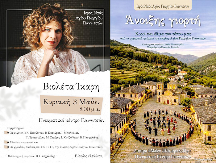 Με την ευλογία της Ιεράς Μητροπόλεως Εδέσσης, Πέλλης και Αλμωπίας η ενορία του Αγίου Γεωργίου Γιαννιτσών διοργανώνει, όπως κάθε χρόνο, διήμερες πολιτιστικές εκδηλώσεις. Οι εκδηλώσεις αυτές είναι συνέχεια των πολιτιστικών δράσεων που πραγματοποιούνται όλο τον χρόνο στο πνευματικό κέντρο του Ναού, «Όσιος Παΐσιος ο Αγιορείτης».