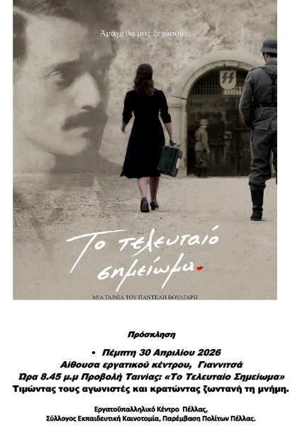 Με αυτή την αφορμή, το Εργατοϋπαλληλικό Κέντρο Πέλλας ο Σύλλογος Εκπαιδευτική Καινοτομία και η Παρέμβαση Πολίτων Πέλλας διοργανώνουν, την παραμονή της Πρωτομαγιάς Πέμπτη 30 Απριλίου, προβολή της ταινίας «Το Τελευταίο Σημείωμα» του Παντελή Βούλγαρη, τιμώντας τους αγωνιστές και κρατώντας ζωντανή τη μνήμη.