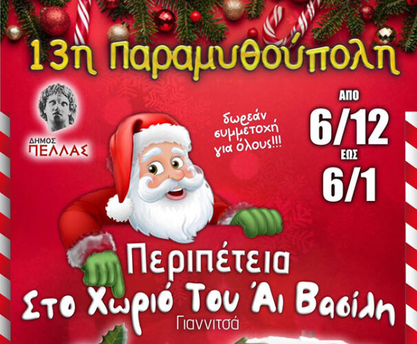 Σας προσκαλούμε σε μια μαγική περιπέτεια: Στην 13η Παραμυθούπολη Γιαννιτσών, από 6 Δεκεμβρίου 2024 έως 6 Ιανουαρίου 2025! Ανακάλυψε:Το χωριό του Άγιου Βασίλη: Ένα μαγευτικό χωριό γεμάτο ξωτικά, όπου τα παιδιά μπορούν να ζήσουν την περιπέτεια του χωριού μαζεύοντας τις σφραγίδες των Χριστουγέννων, να γράψουν την επιστολή τους στον Άγιο και να συμμετάσχουν σε διάφορες […]