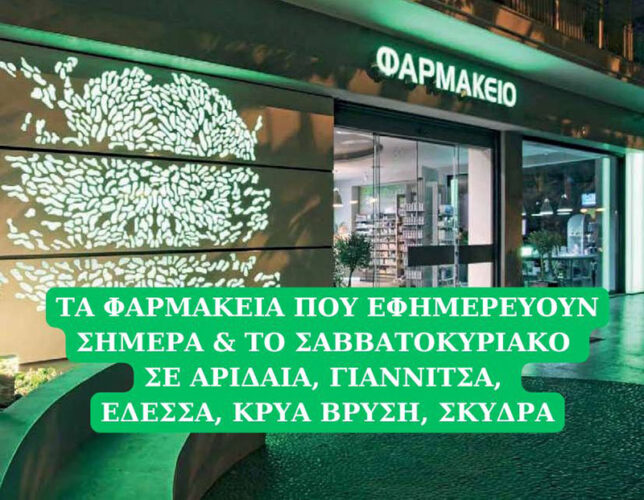 Ν. ΠΕΛΛΑΣ: ΤΑ ΦΑΡΜΑΚΕΙΑ ΠΟΥ ΕΦΗΜΕΡΕΥΟΥΝ ΣΗΜΕΡΑ TETAΡΤΗ (15/4)