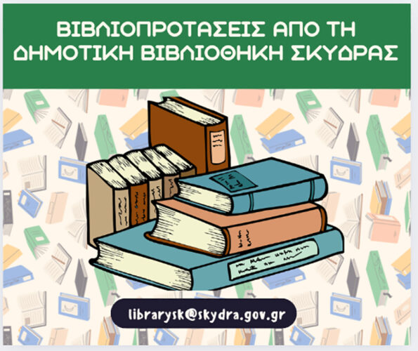 Η Δημοτική Βιβλιοθήκη Σκύδρας «Λεόντιος Σιδηρόπουλος» παρουσιάζει παρακάτω τις βιβλιοπροτάσεις της για το μήνα Ιούνιο 2025: ✍️ Για τους ενήλικες:1)«Γυναίκες Θάλασσες», Σίσσυ Θεοφανοπούλου, μυθιστόρημα.2)«Αγάπη μου, κολυμπάς με καρχαρίες», Κατερίνα Τσεμπερλίδου, διηγήματα.3)«Μιχαήλ Αγγελος», Claudio Gamba,ζωγραφική.4)«Ο δρόμος των ασκητών»,Tito Colliander, χριστιανική ηθική.5)«Πώς να είσαι Παριζιάνα όπου κι αν βρίσκεσαι», συλλογικό, γυναίκες – μόδα – Γαλλία.6)«Μαθαίνοντας να μ’ […]