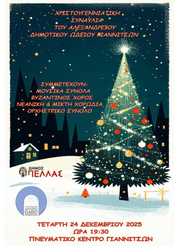 Η Μεγάλη Χριστουγεννιάτικη Συναυλία του Αλεξάνδρειου Δημοτικού Ωδείου Γιαννιτσών (ΑΔΩΓ), θα πραγματοποιηθεί την παραμονή της μεγάλης γιορτής, την Τετάρτη 24.12.2025 και ώρα 19:30 το βράδυ, στην κεντρική αίθουσα του Πνευματικού Κέντρου Γιαννιτσών. Συμμετέχουν:🎵 Τα Μουσικά Σύνολα του Ωδείου🎵 Βυζαντινός Χορός🎵 Νεανική και Μικτή Χορωδία🎵 Ορχηστρικό Σύνολο Τη συναυλία επιμελείται και παρουσιάζει ο Διευθυντής του ΑΔΩΓ, […]